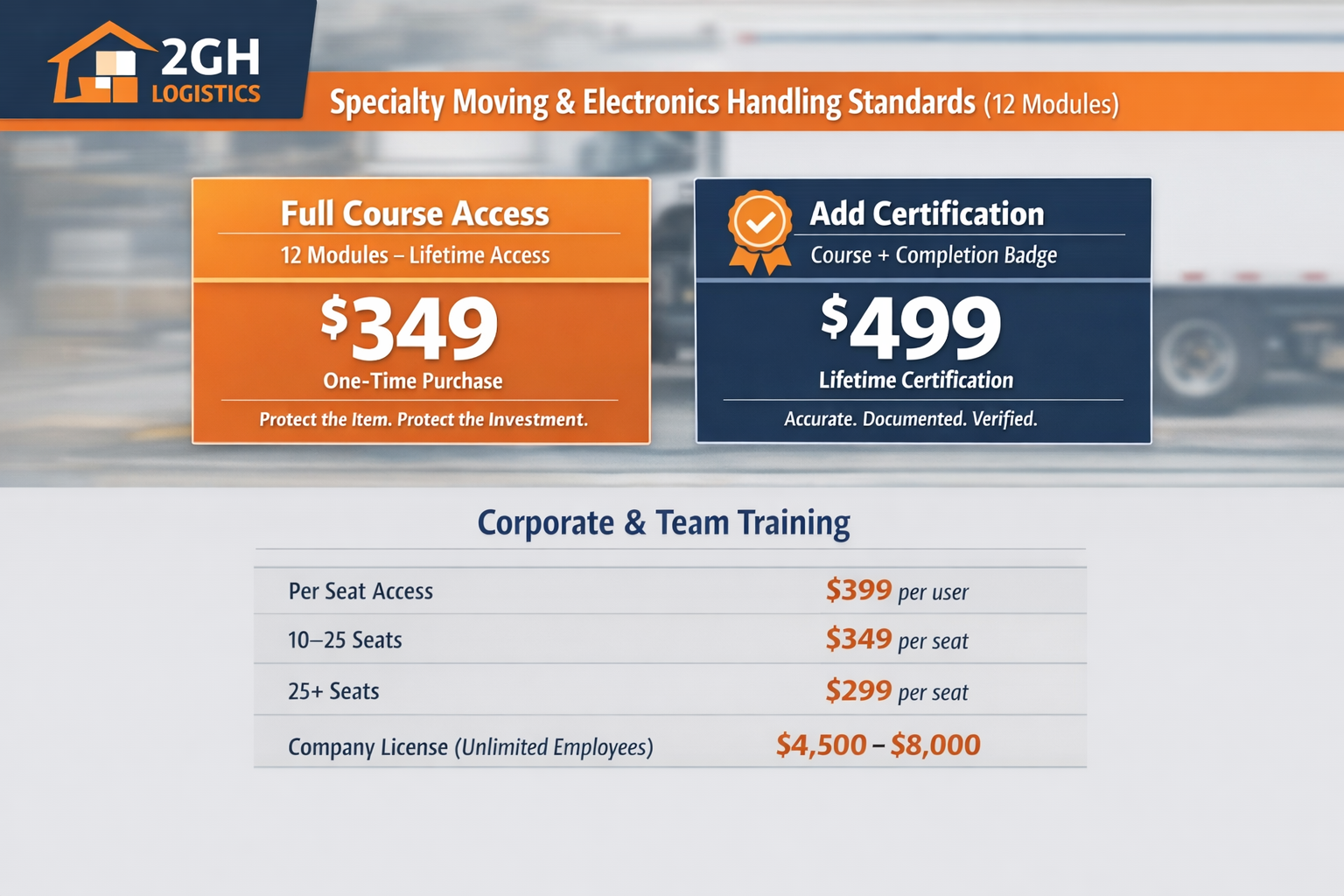 Welcome to the 2GH Logistics Professional Moving Course — a practical, video-supported training program designed to teach essential moving skills with care, precision, and professionalism. Whether you’re new to moving or refining your technique, this 10-part course combines expert guidance with hands-on experience.